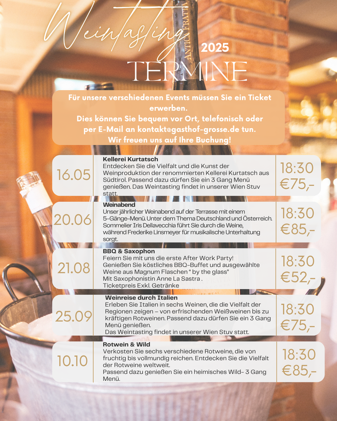 Für unsere verschiedenen Events müssen Sie ein Ticket erwerben. Dies können Sie bequem vor Ort, telefonisch oder per E-Mail an kontakt@gasthof-grosse.de tun. Wir freuen uns auf Ihre Buchung!